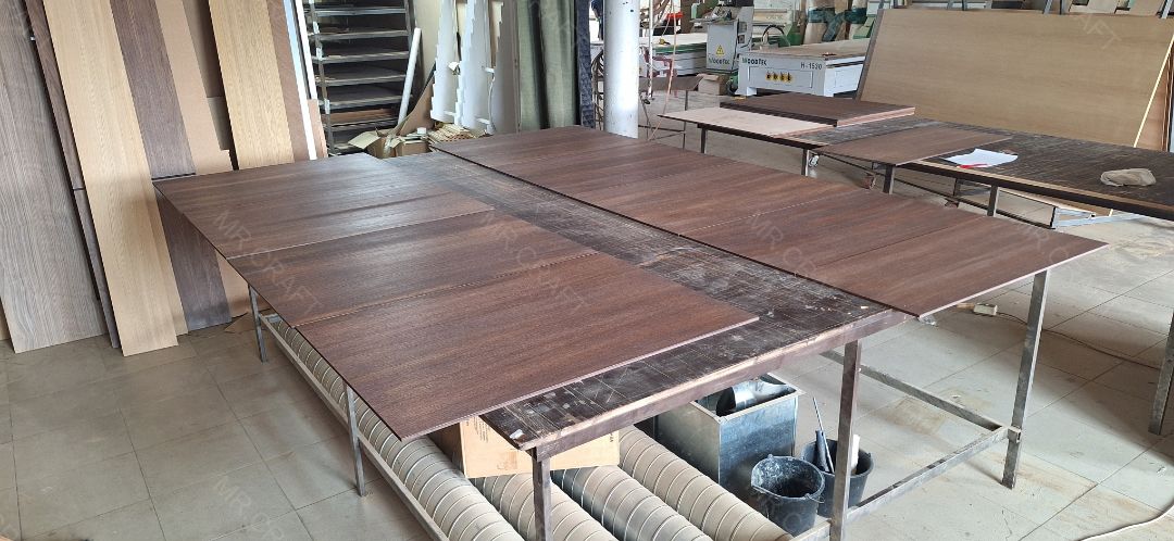 Процесс начинается с подготовки основания — как правило, это МДФ или другой стабильный материал, устойчивый к деформации. Затем на специальном оборудовании происходит наклеивание шпона. Используются прочные и безопасные клеевые составы, которые обеспечивают долговечность сцепления.